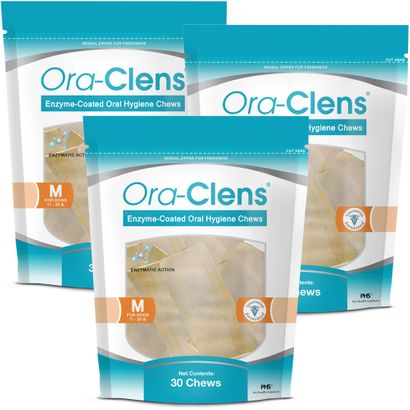 Ora-Clens Oral Hygiene Chews help clean your dog's teeth while they chew. These beef hide treats are coated with enzymes that help remove plaque and prevent harmful bacteria from building up.