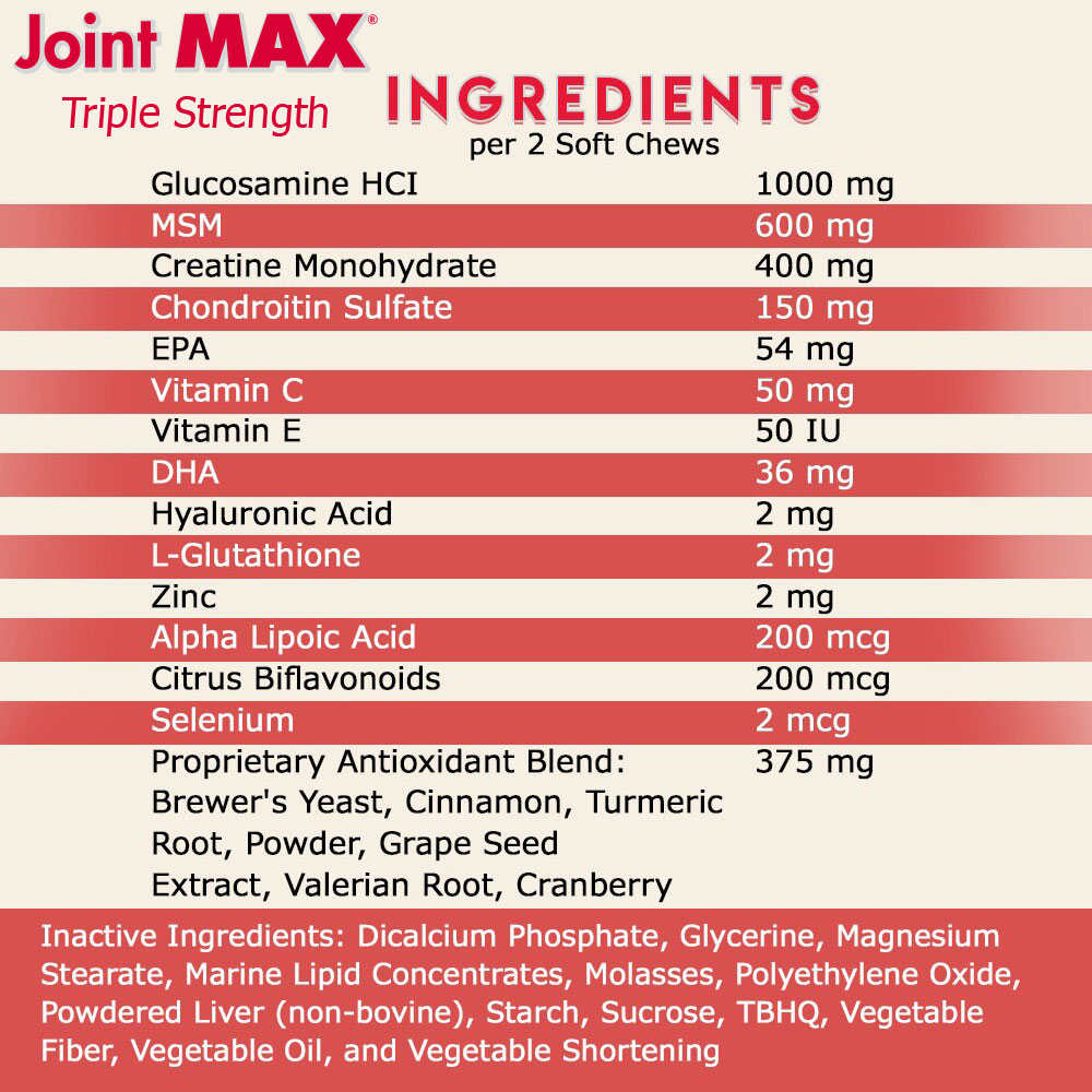 Joint MAX® Triple Strength (TS) Soft Chews is recommended for joint health with powerful active ingredients that enhance the functions of joint and connective tissue as well as antioxidants to help reduce oxidative stress. The Joint Max TS proprietary blend was selected to target every aspect of joint health: lubrication, cushioning of tissues, and support of cartilage, connective tissues, and bones.