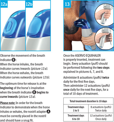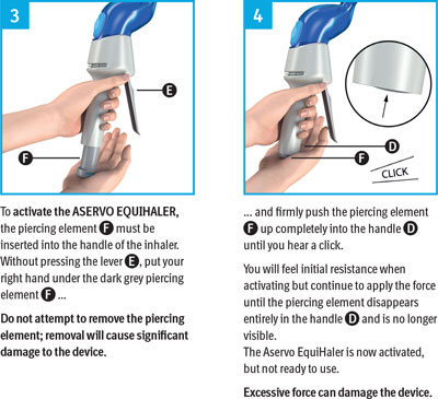 Please review the User Manual with horse owners to ensure they understand the entire contents. The User Manual includes important instructions regarding the proper handling and use of ASERVO EQUIHALER. Demonstration of the activation, administration and storage of ASERVO EQUIHALER with the horse owner is highly recommended.