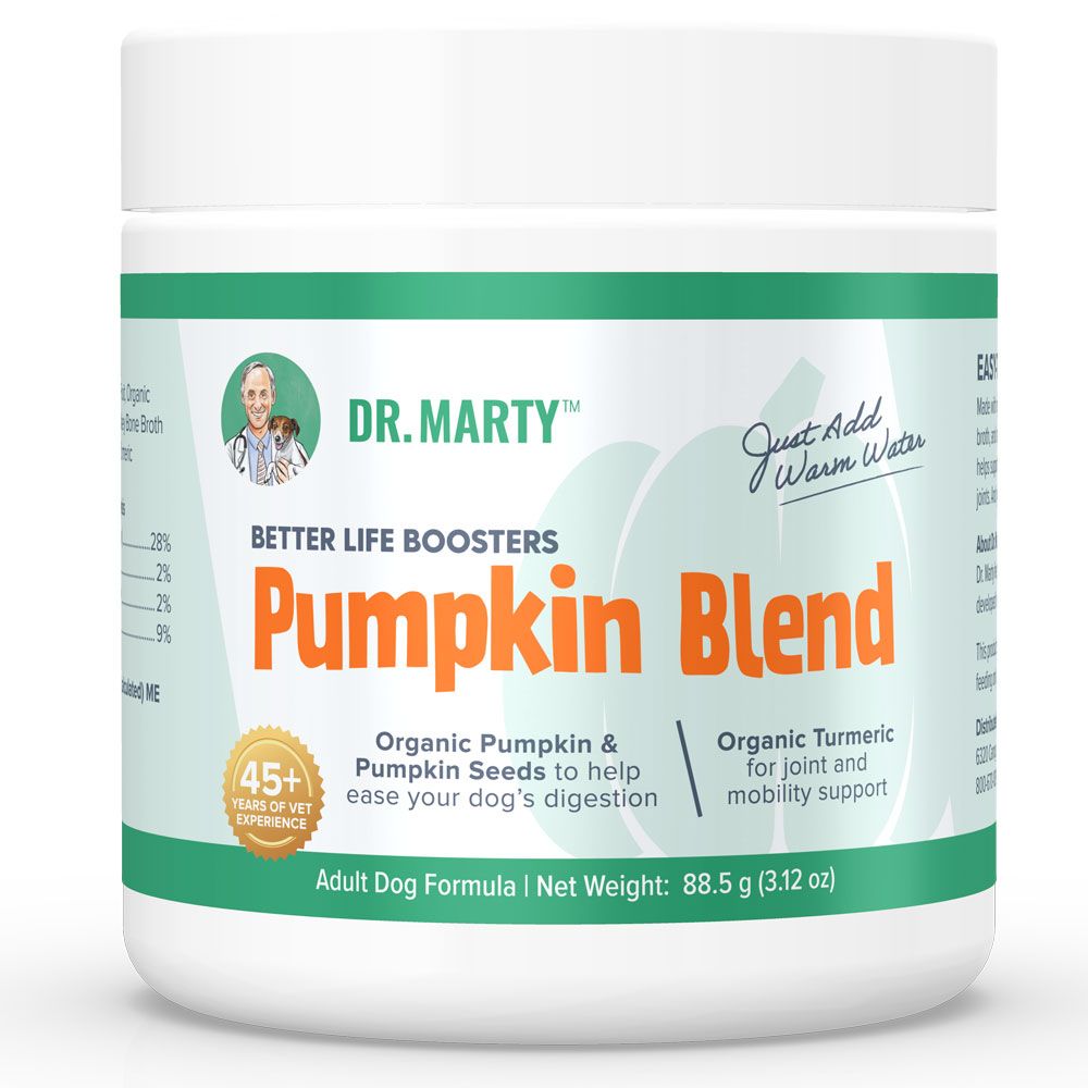 Dr. Marty Better Life Boosters Pumpkin Blend. Made with organic pumpkin, collagen-rich turkey bone broth, & organic turmeric, this powdered formula helps support firm poops, easy digestion, & strong joints. And your dog will love the delicious flavor!