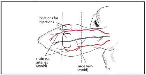 In lactating dairy cattle the injection techniques for subcutaneous (SC) injection in the posterior aspect of the ear where it attaches to the head (base of the ear) can be made by the rostral or ventral injection techniques.