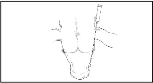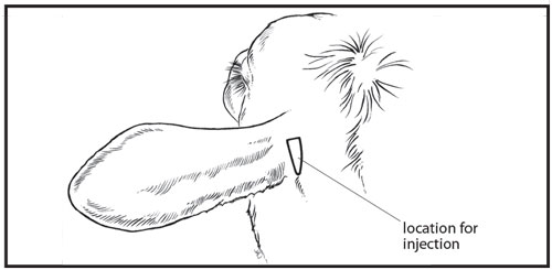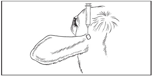 In beef and non-lactating dairy cattle the SC injection in the base of the ear can be made by the rostral, ventral or toward the opposite eye injection techniques.