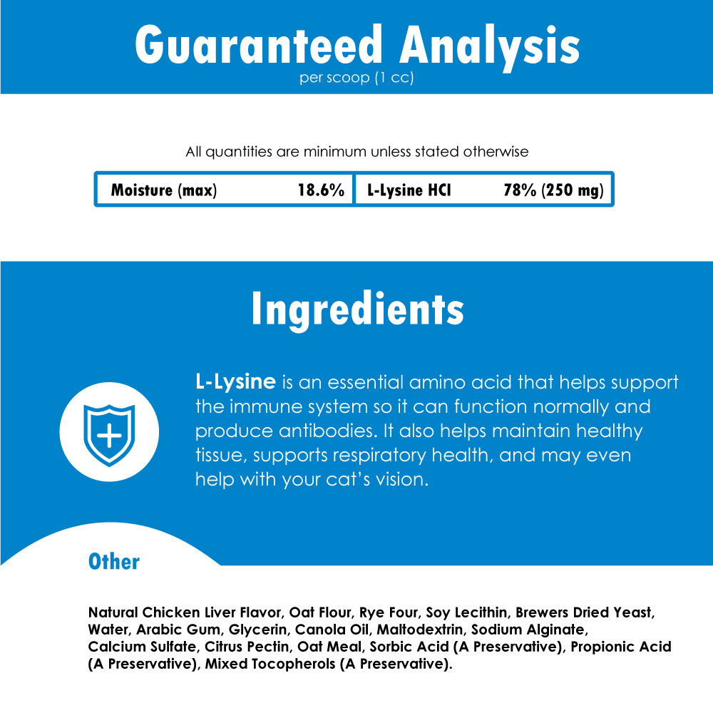 L-Lysine HCL Immune System Support for Cats helps keep your cat healthy by supporting the immune system naturally so that it can function normally and produce antibodies. Felisyl L-Lysine HCL Immune System Support for Cats also helps maintain healthy tissue, supports respiratory health, and may even help with your cat's vision. The L-Lysine is in palatable poultry, and the flavored fish base was making these granules easy to give to your cat, sprinkle over or mix with food.