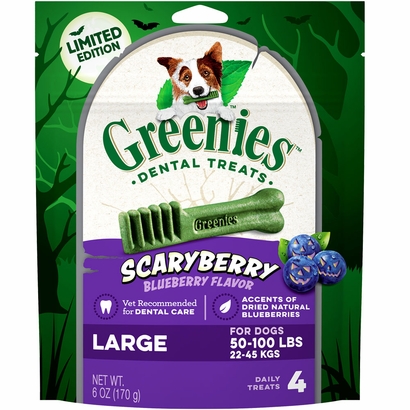 GREENIES ScaryBerry Blueberry Flavor Trick or treat, smell our paws, put a GREENIES in our jaws! Halloween is all about treating. That's why GREENIES ScaryBerry Blueberry Flavor Large Halloween Dental Chew Treats for Dogs are the perfect surprise for your little dog's Halloween treat bag. They'll immediately want to sink their vampire fangs into the chewy texture that helps fight plaque and tartar, cleans down to the gumline, and freshens breath. Delicious and spooky-powerful, these small dog treats are recommended by veterinarians for at-home oral care. They're nutritionally complete and balanced for adult dogs and made with easy-to-digest, natural ingredients plus vitamins, minerals, and other nutrients. So, get your dog's Halloween costume ready and prepare to have a scary-good time this Halloween with GREENIES Treats for Dogs!