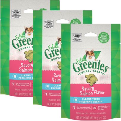 FELINE GREENIES Savory Salmon Flavor Dental Cat Treats were designed to help keep your cat's teeth clean and healthy. The crunchy texture of these irresistible cat snacks helps clean teeth, reduce tartar buildup, and freshen cat breath, letting you enjoy cuddle time even more. Made with natural ingredients plus vitamins, minerals, and other nutrients, these tasty natural dental treats are nutritionally complete and balanced for adult cats. Plus, FELINE GREENIES Dental Treats contain less than 2 calories per treat and are the #1 vet recommended feline dental treat.* For some healthy play, try placing a few cat treats inside a treat dispenser toy and watch your cat chase and swat away. Give your cat FELINE GREENIES Dental Treats, and you're sure to hear happy purrs of joy. FELINE GREENIES Daily Dental Treats for healthy and happy dental care. *Among U.S. veterinarians who recommend dental treats for at-home oral care.