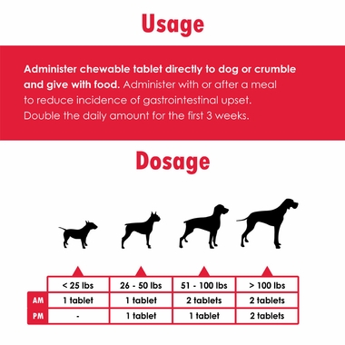 Administer chewable tablet directly to dog or crumble and give with food. Administer with or after a meal to reduce incidence of gastro- intestinal upset. Double the daily amount for the first 3 weeks.