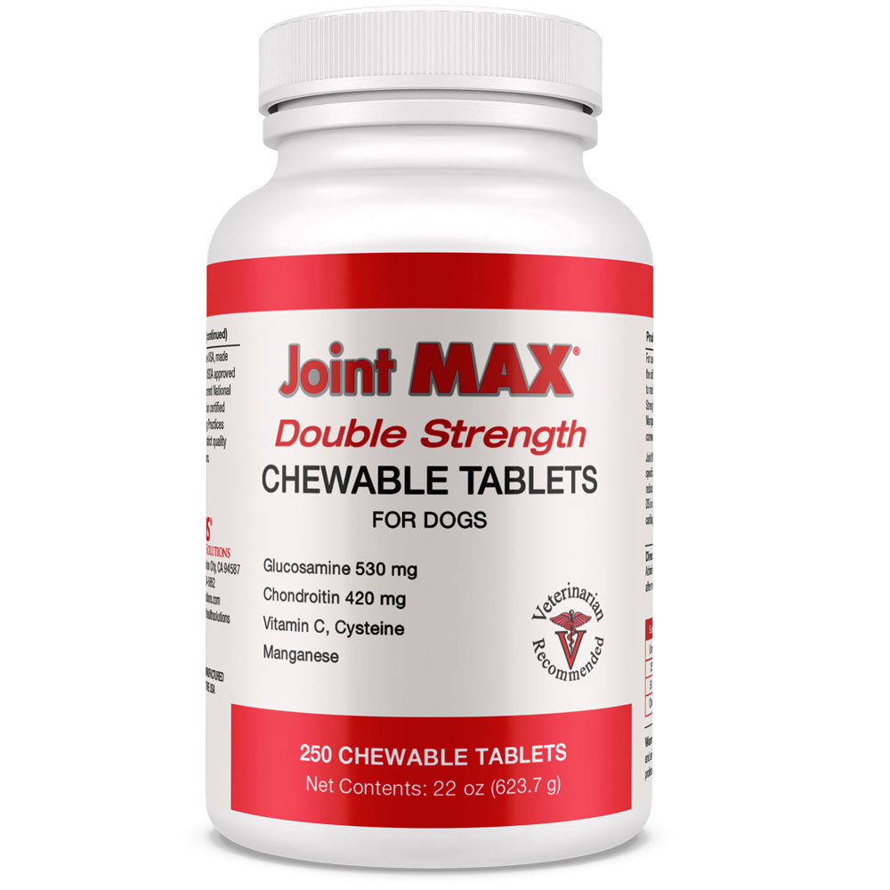 Joint MAX® Double Strength Chewable Tablets (DS) for dogs may ease the achiness from normal daily exercise and activity while helping to maintain healthy cartilage and joints in your dog. Our Double Strength formula means double the Glucosamine, Chondroitin, and Manganese for extra support of the structural integrity of joints and connective tissues.