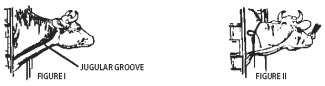 - Restraint. A stanchion or chute is ideal for restraining the animal. With a halter, rope, or cattle leader (nose tongs), pull the animal's head around the side of the stanchion, cattle chute, or post in such a manner to form a bow in the neck (see Fig. II), then snub the head securely to prevent movement. By forming the bow in the neck, the outside curvature of the bow tends to expose the jugular vein and make it easily accessible. Caution: Avoid restraining the animal with a tight rope or halter around the throat or upper neck which might impede blood flow. Animals that are down present no problem so far as restraint is concerned.