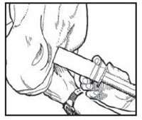 5. The selected dose of paste should be deposited onto the back and top of the horse's tongue. Introduce tip of paste syringe into the side of the horse's mouth at the space between the front (incisor) and back (molar) teeth. Deposit paste on the horse's tongue by depressing the plunger of the syringe as far as the dose ring permits. Remove tip of syringe from horse's mouth.
