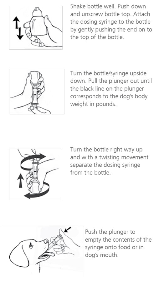 To prevent accidental overdosing of small dogs, only use the small dosing syringe. The large syringe provided cannot be used to measure doses for dogs weighing less than 15 lbs (6.8 kg). For dogs less than 15 lbs, use the small dosing syringe (blue print) provided in the package (see dosing procedure below).