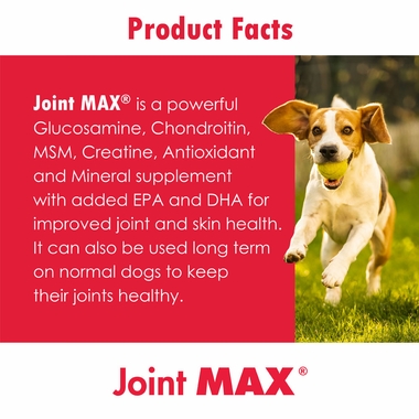 Joint MAX® Double Strength Chewable Tablets (DS) for dogs may ease the achiness from normal daily exercise and activity while helping to maintain healthy cartilage and joints in your dog. Our Double Strength formula means double the Glucosamine, Chondroitin, and Manganese for extra support of the structural integrity of joints and connective tissues.