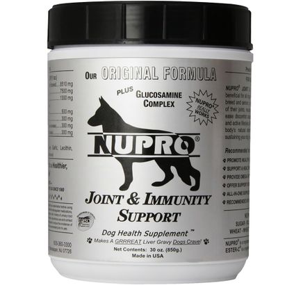 All Natural Joint Support Supplement For Dogs Nupro® health supplements for dogs are scientifically developed to provide dogs of all breeds and ages valuable nutrients that are often missing from traditional processed and cooked dog foods. The full line of supplements from Nupro® are specially formulated to improve your dog’s health, both inside and out. Improve Your Dog’s Joint Health The Nupro® (30oz) Joint Support for Dogs supplement is essentially an enhanced version of our original formula. It provides all of the same great benefits, but has been enriched with MSM, Ester-C and Glucosamine complex to further improve bone and joint structure and function in all adult dogs. The unique formula in the joint support supplement includes essential raw nutrients, without using ingredients, such as preservatives, wheat, by-products or corn, which can sometimes be harmful. | |