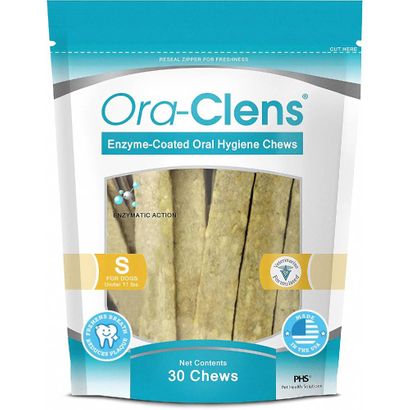 Ora-Clens Oral Hygiene Chews help clean your dog's teeth while they chew. These beef hide treats are coated with enzymes that help remove plaque and prevent harmful bacteria from building up.