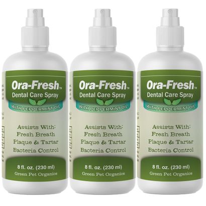 Ora-Fresh Dental Care Spray is a convenient and easy-to-use oral care solution that helps control plaque, tartar, and bad breath in pets. It comes in a spray bottle, allowing for hassle-free application. The formula contains peppermint oil, which provides a refreshing scent and taste while delivering its dental benefits.
