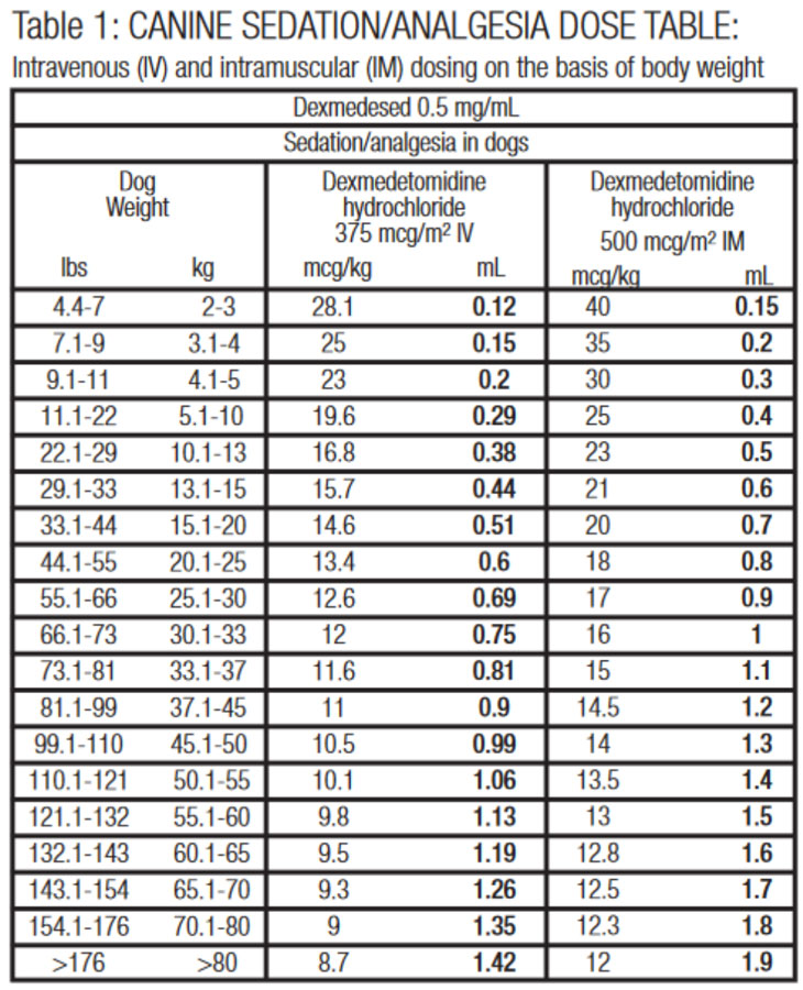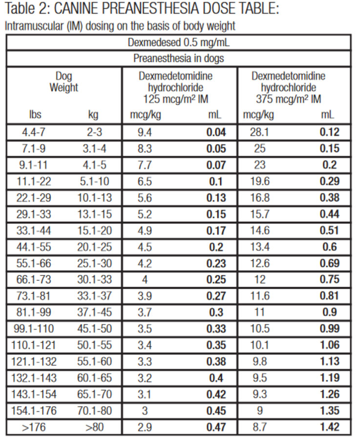 The choice of preanesthetic dose depends on the duration and severity of the procedure, as well as the anesthetic regime. The following two tables may be used to determine the correct dexmedetomidine hydrochloride dosage. Note that the mcg/kg dosage decreases as body weight increases. For example, dogs weighing 2 kg are dosed at 28.1 mcg/kg dexmedetomidine hydrochloride IV, compared to dogs weighing 80 kg that are dosed at 8.7 mcg/kg. Due to the small volume of administration, accurate dosing is not possible in dogs weighing less than 2 kg (4.4 lb).