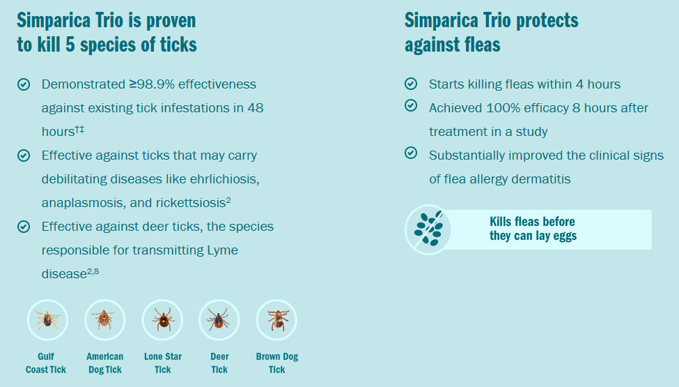 ‡Against Amblyomma americanum, Simparica Trio demonstrated 99.4% effectiveness 72 hours after treatment of existing infestations.