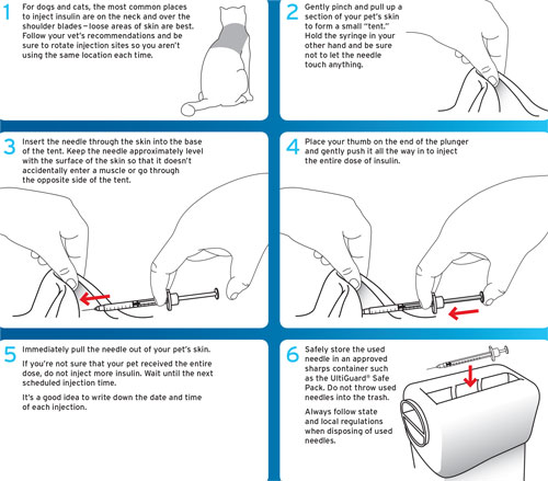 Be sure to read and follow the instructions that accompany the insulin prescribed by your veterinarian. For example, many types of insulin require of the vial to mix the contents before each use. Also make sure you're using the proper insulin syringe: U-40 and U-100 syringes are not interchangeable.
