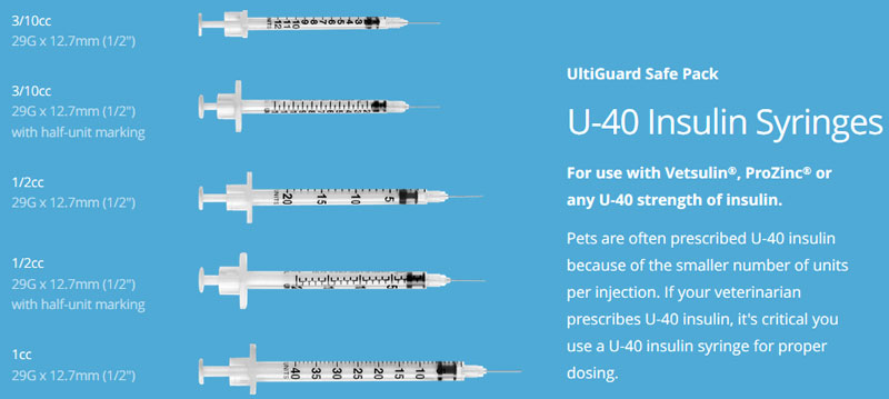 In order to give your pet the correct dose of insulin, talk to your vet to make sure you're using the proper syringe for the insulin they've prescribed. U-40 insulin must be injected with a U-40 syringe, and U-100 insulin must be injected with a U-100 syringe. U-40 and U-100 syringes are not interchangeable.