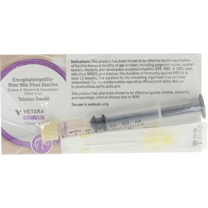 Equine combination vaccine Protects against Equine Encephalomyelitis (EEE, WEE and VEE) Also protects against Tetanus and West Nile Virus For use in healthy horses and foals 4 months of age and older Killed virus vaccine, no mixing required Directions