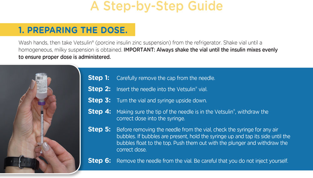 The initial recommended vetsulin dose is 0.5 IU insulin/kg body weight. Initially, this dose should be given once daily concurrently with, or right after a meal.