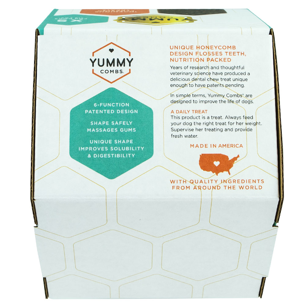 Yummy Combs has a wide, flat, 6-sided patented design that deters gulping and encourages longer chew time. Our added, patented ingredient, Slick'M, creates a slippery surface that greatly reduces the possibility of any portion becoming lodged in the esophagus. The thin wall construction helps preserve volatile ingredients and allows the treat to dissolve quickly while also accelerating digestion so the nutrients are absorbed more effectively.