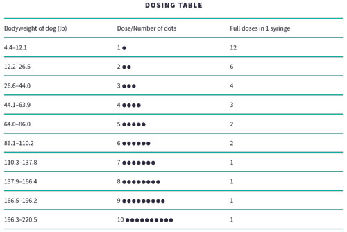 The following table provides the acceptable dosage for each weight range. Each dot (•) represents 0.25 mL of Sileo.