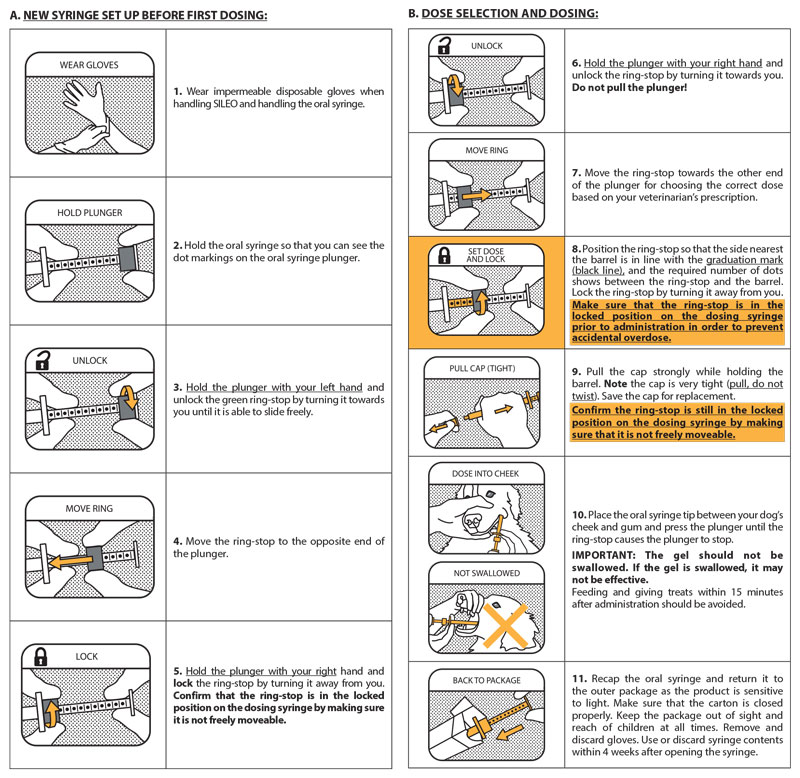 This sheet summarizes the basic information about Sileo and does not replace the instructions from your veterinarian. Talk to your veterinarian if you have questions regarding any part of this information or if you want to know more about Sileo. The syringe must be used in order to correctly dose the drug to your dog. You may use either a full, unused syringe or a partially used syringe that contains enough gel for the desired dose.